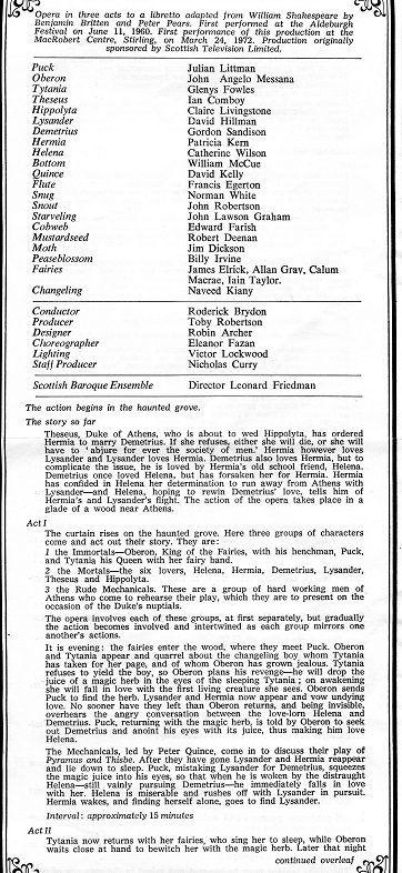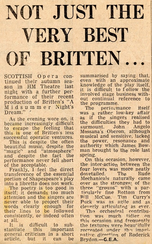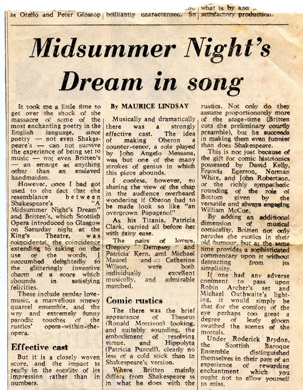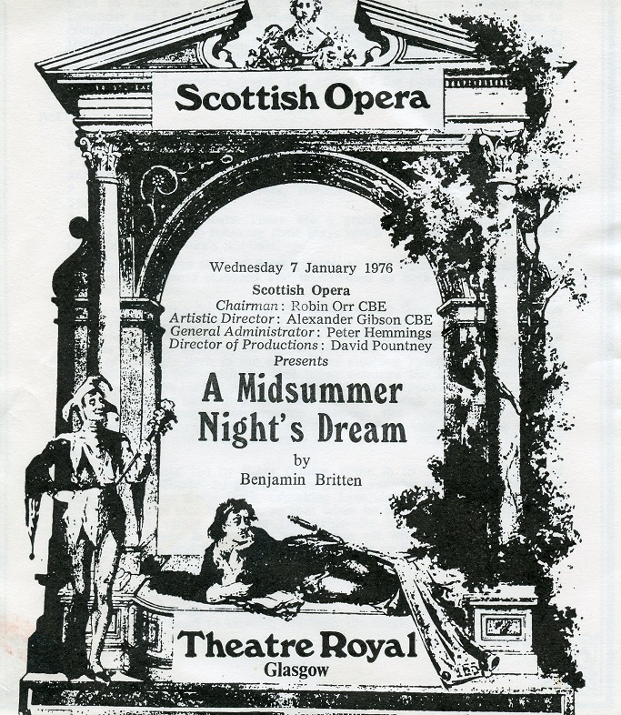 A Midsummer Night’s Dream William Shakespeare’s play, A Midsummer Night’s Dream, was adapted by Benjamin Britten and Peter Pears to create an opera in three acts. In the Scottish Opera’s 1972 and 1976 productions, Bill was cast as Bottom. Photocredits: Eric Thorburn