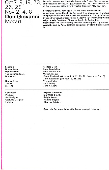 Bill was cast as The Commendatore in the 1967 Scottish Opera production of Mozart’s Don Giovanni. The Commendatore is killed by Don Giovanni but his statue comes to life in Act III, allowing him to have his revenge.
