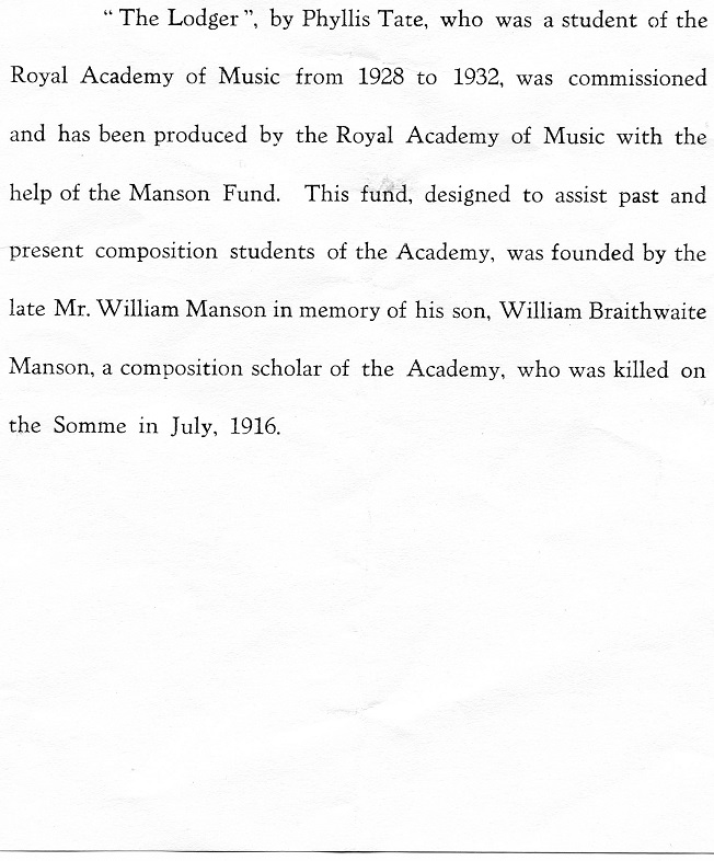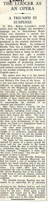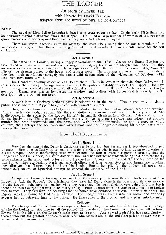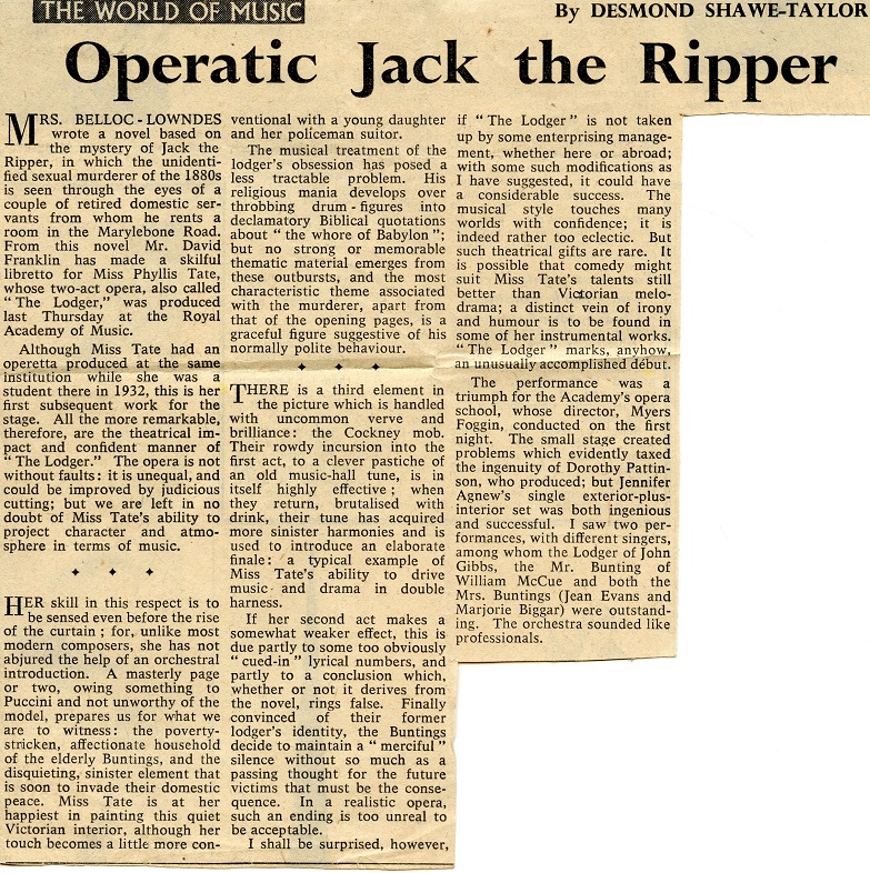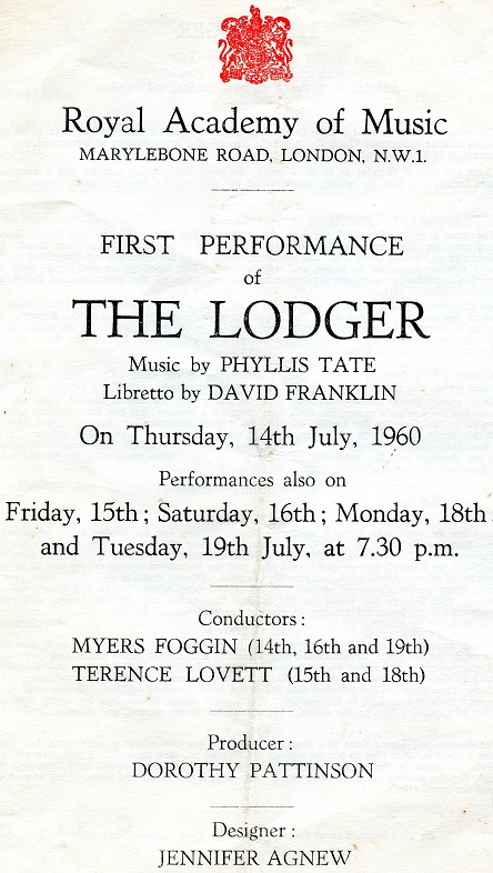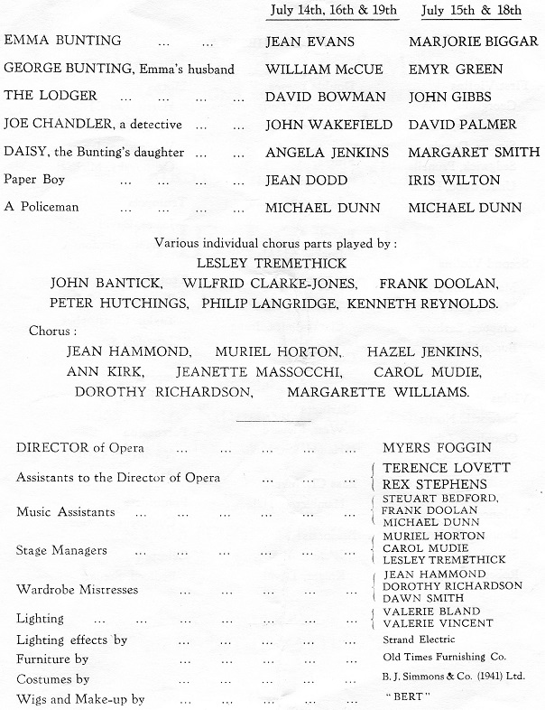 The Lodger An opera by Phyllis Tate, based on the story of Jack The Ripper. The Lodger was premiered by the students of the Royal Academy of London in 1960. Bill was cast as George Bunting. Photocredits: Martin Taylor Photocredits: Martin Taylor
